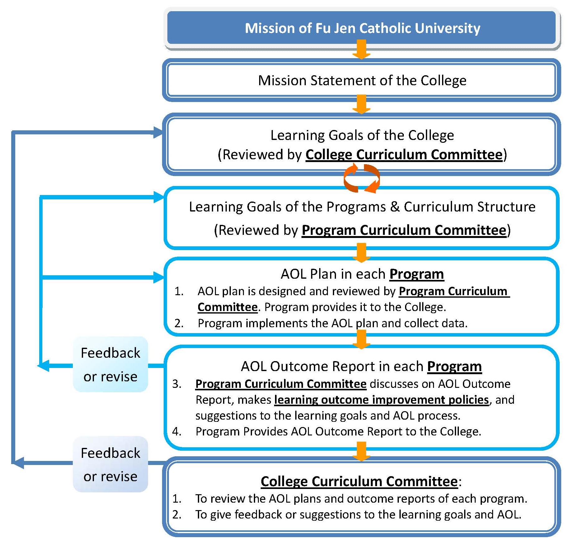 The focus of Assurance of Learning (AOL) is on each program. Each program should establish their learning goals for different educational level, design and implement AOL plan, collect and analyze data of students learning outcome, complete AOL outcome report. Program Curriculum Committees should put emphasis on learning outcome improvement policies. The College Curriculum Committee will review each program’s AOL plans and AOL outcome reports to give feedback or suggestions. The following chart illustrates the AOL process.