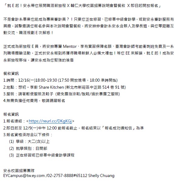 【EY-安永】校園招募說明會暨餐敘(線上報名至2024/12/9_12時止)