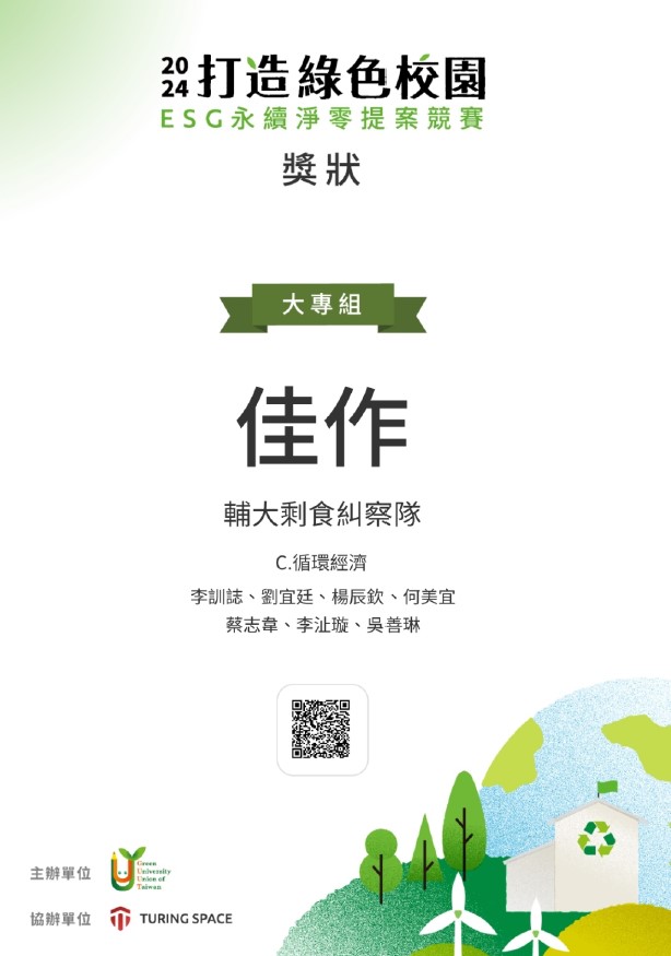 賀本系會四乙吳善琳同學參加【2024打造綠色校園ESG永續淨零提案競賽】大專組 佳作