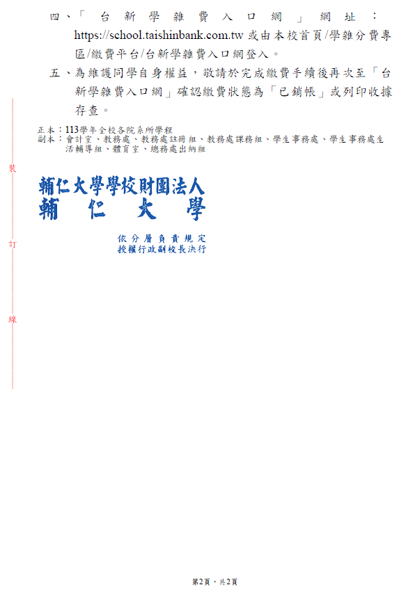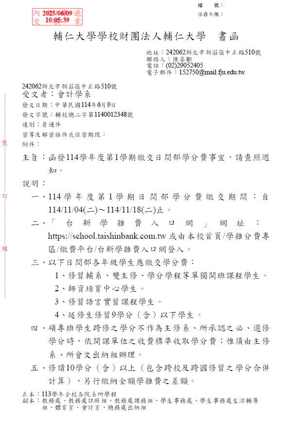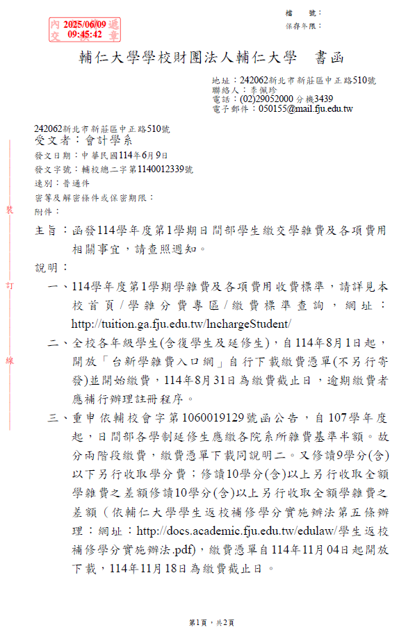 [公告] 114學年度第1學期日間部學生繳交學雜費、學分費及各項費用相關事宜