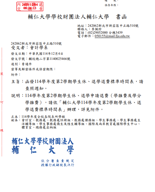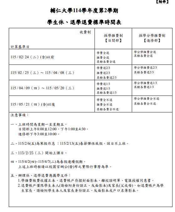 [公告] 114-2學期學生休、退學退費標準時間表