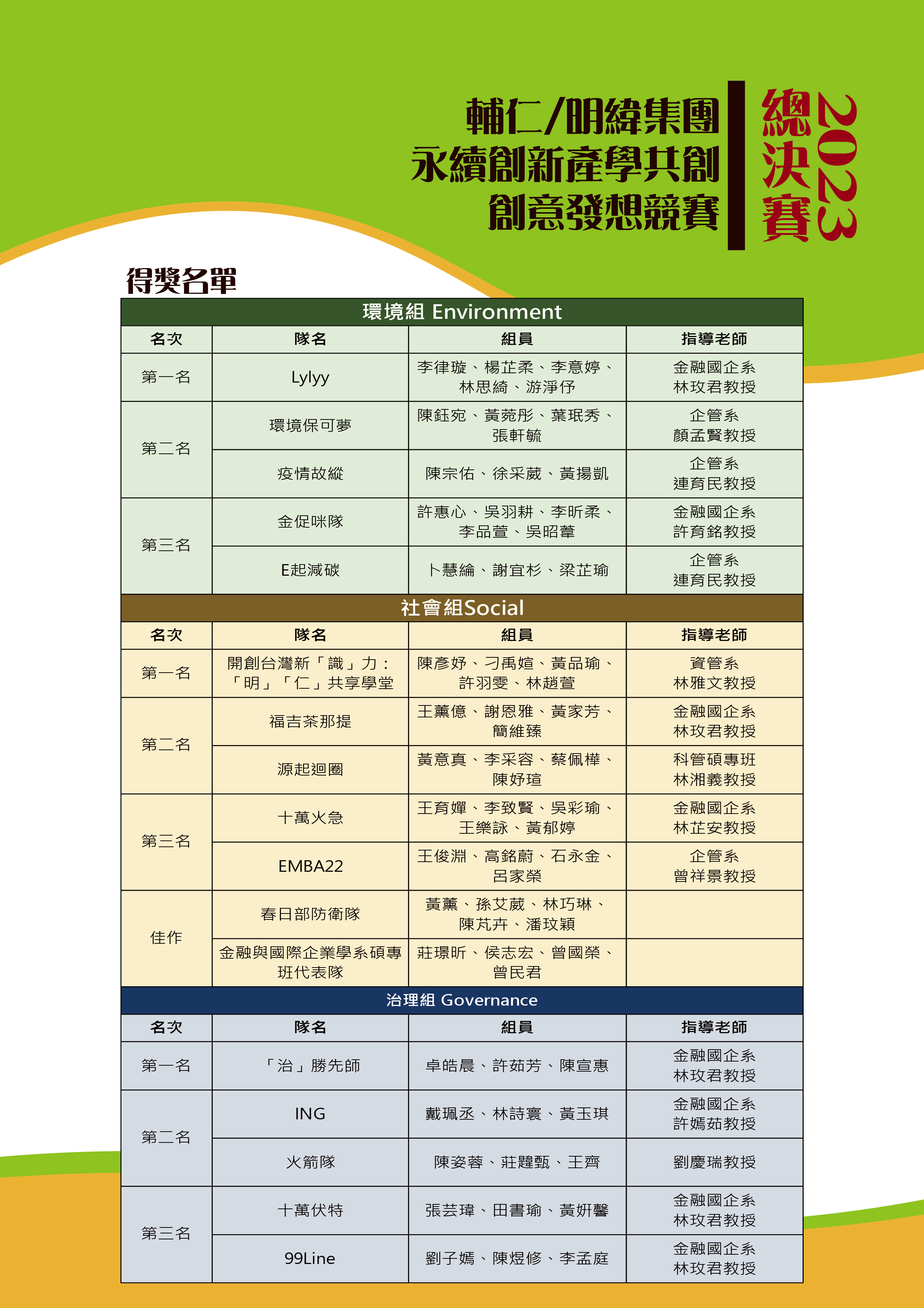 企業首要之務是環顧世界整體情勢,擬定公司應當遵循的新典範,努力從全球商業活動中創造社會價值;延攬擅長提升組織的效率和營運的人才,以執行組織所制定的策略,也十分重要。因此,明緯企業永續發展學院與輔仁大學管理學院攜手合作,以Environment(環境)、Social(社會)、Governance(治理)三大面向,鼓勵輔大學生團隊前來挑戰企業永續創新之需求,以培育為來永續創新人才。