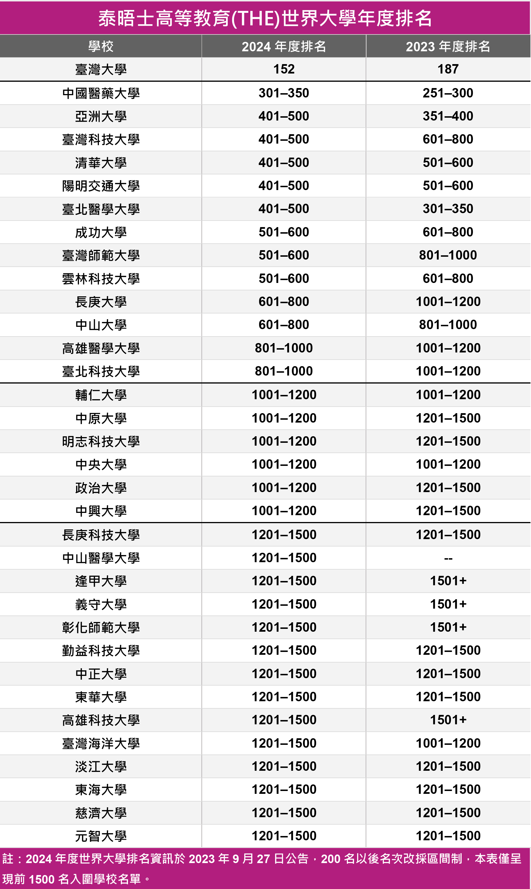 涵蓋了108個國家和地區,全球共1904所學校入榜,泰晤士高等教育特刊(Times Higher Education, THE) 公布2024年度世界大學排名,全台共45所入榜,臺灣大學仍維持全台首位,輔仁大學維持全球1001-1200區間、全國排名第15,且經多年持續精進努力,本校包含研究相關之聲譽及研究收入的「研究環境」指標首度站上全球排名前五百名!
