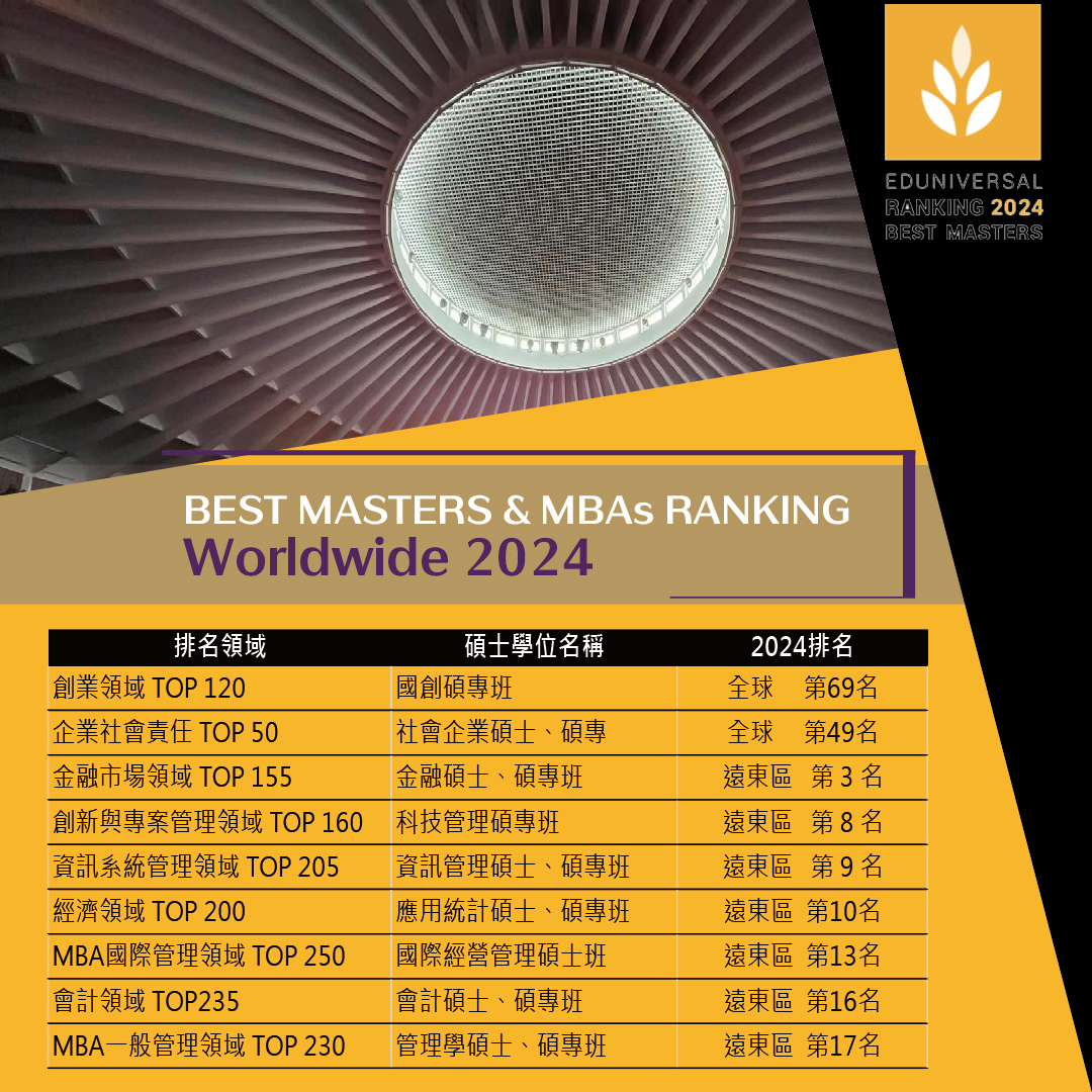 Eduniversal公佈2024全球最佳1000大商學院評比(Business Schools Ranking),輔仁大學管理學院獲3個棕櫚葉,排名僅次於台大管理學院、政大商學院、中山管理學院及台科大管理學院,除了整體獲得機構評選肯定,管院九個碩士班也在領域分類排行(Ranking of The Best Master & MBA)中表現卓越,其中獲選全球百大的國創碩專班入榜「創業類」全球69名,社會企業碩士/碩專班在「企業社會責任領域」全球排名49。
