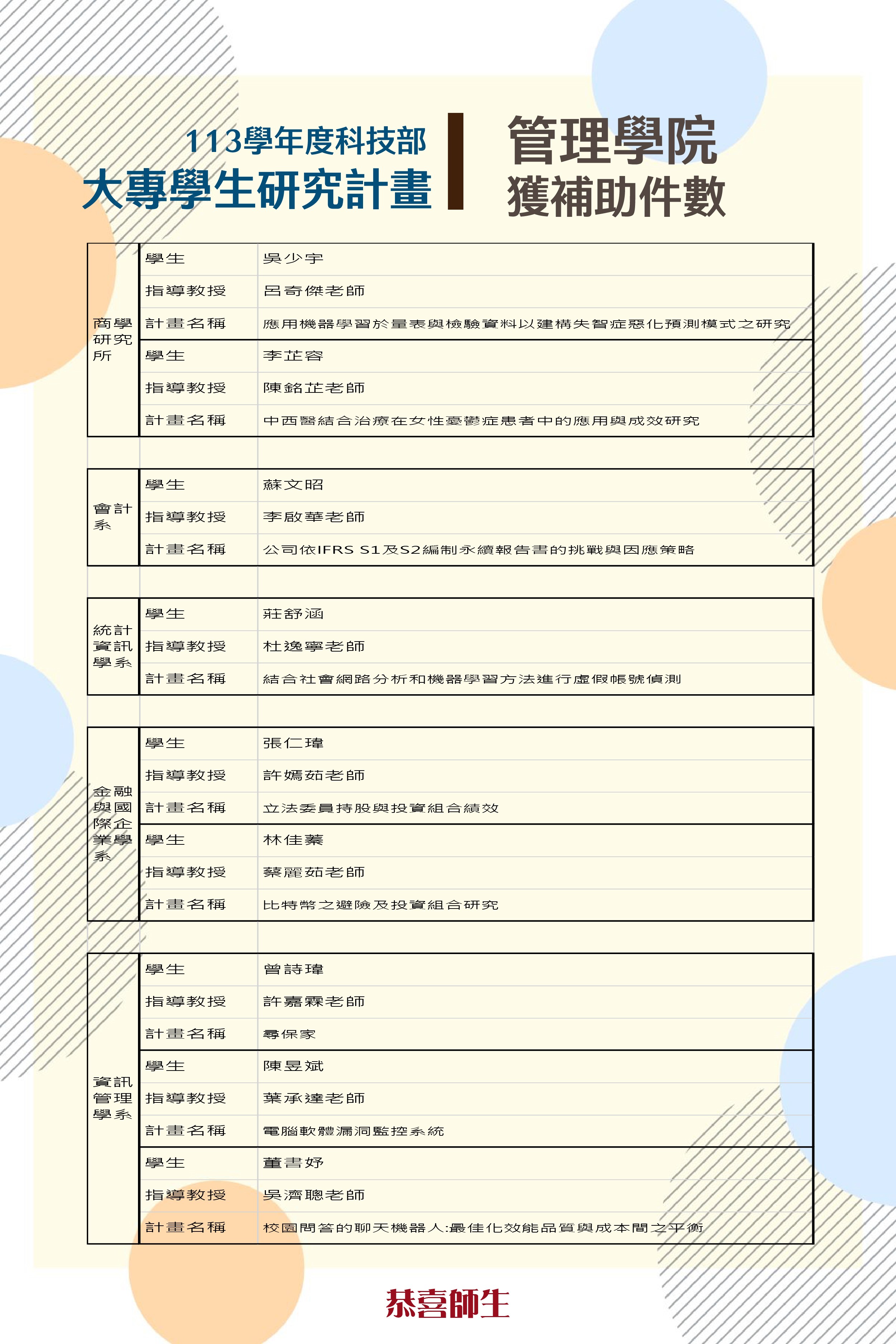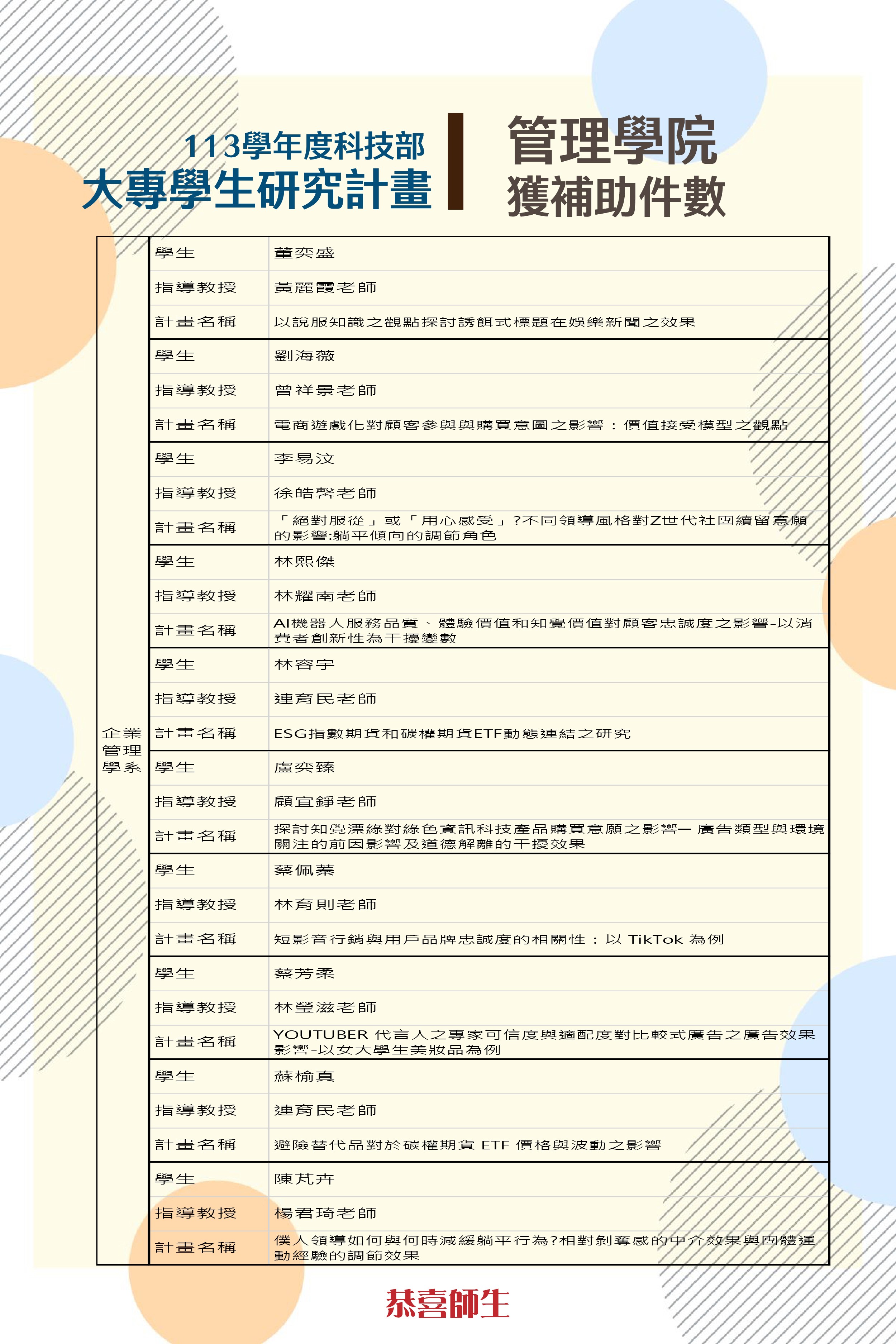 學生願意投入時間對主題進行深入研究,加上指導老師用心的教導,始獲科技部肯定,相信這樣的學習可以讓同學學到更多書本之外的能力,為未來的研究所或工作做更好的準備。管理學院學生獲選件數年年增加,感謝師長給予學生的指導,並恭喜獲選的學生~