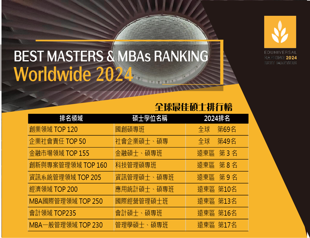 僅次於台大管理學院、政大商學院、中山管理學院及台科大管理學院,除了整體獲得機構評選肯定,管院九個碩士班也在領域分類排行(Ranking of The Best Master & MBA)中表現卓越。